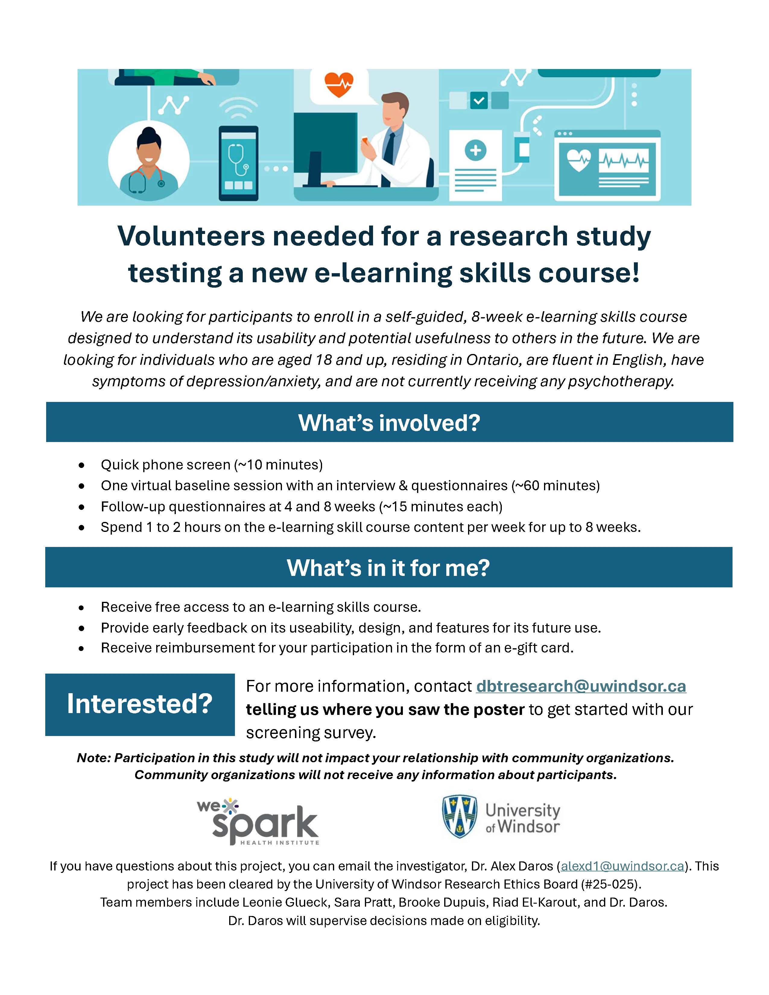 If you have questions about this project, you can email the investigator, Dr. Alex Daros (alexd1@uwindsor.ca). This project has been cleared by the University of Windsor Research Ethics Board (#25-025). Team members include Leonie Glueck, Sara Pratt, Brooke Dupuis, Riad El-Karout, and Dr. Daros. Dr. Daros will supervise decisions made on eligibility.