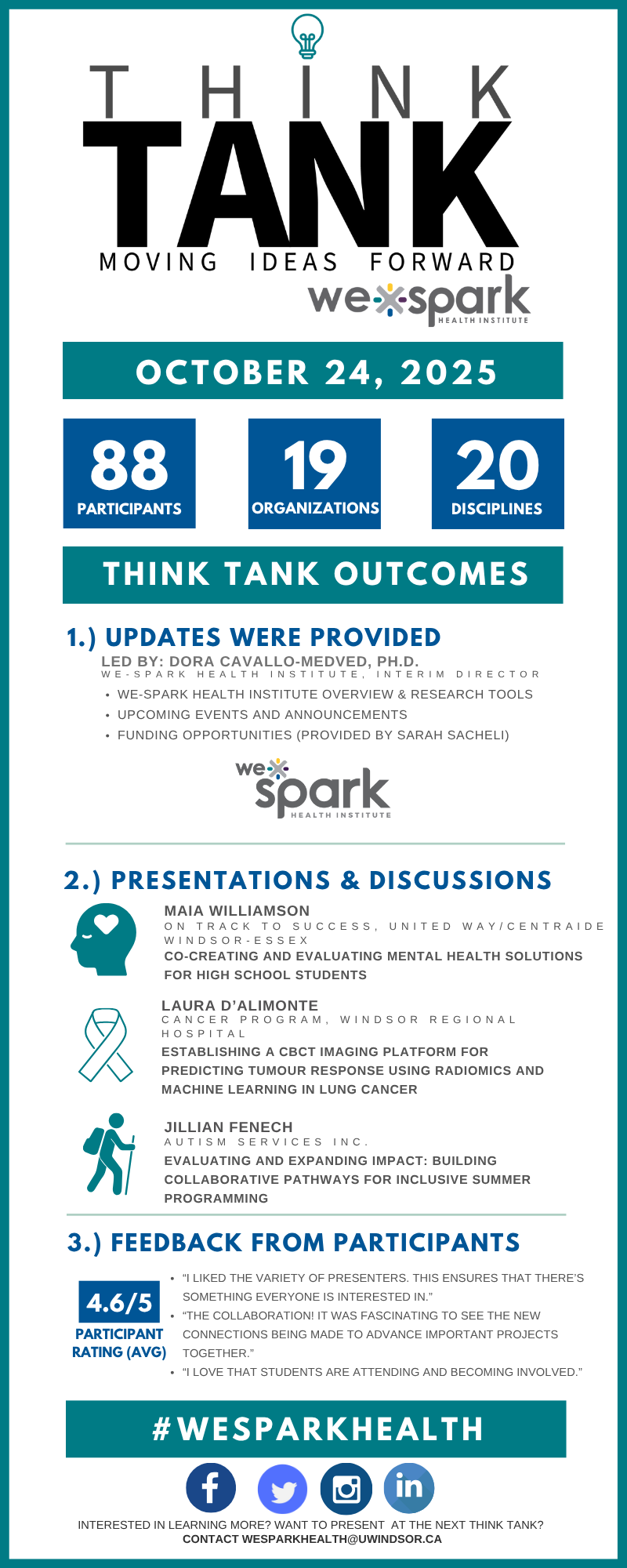 If you have any questions/ideas for our Think Tanks, or would like to present at a future Think Tank, please contact us at wesparkhealth@uwindsor.ca. To learn more about these events, please visit our Think Tank webpage!