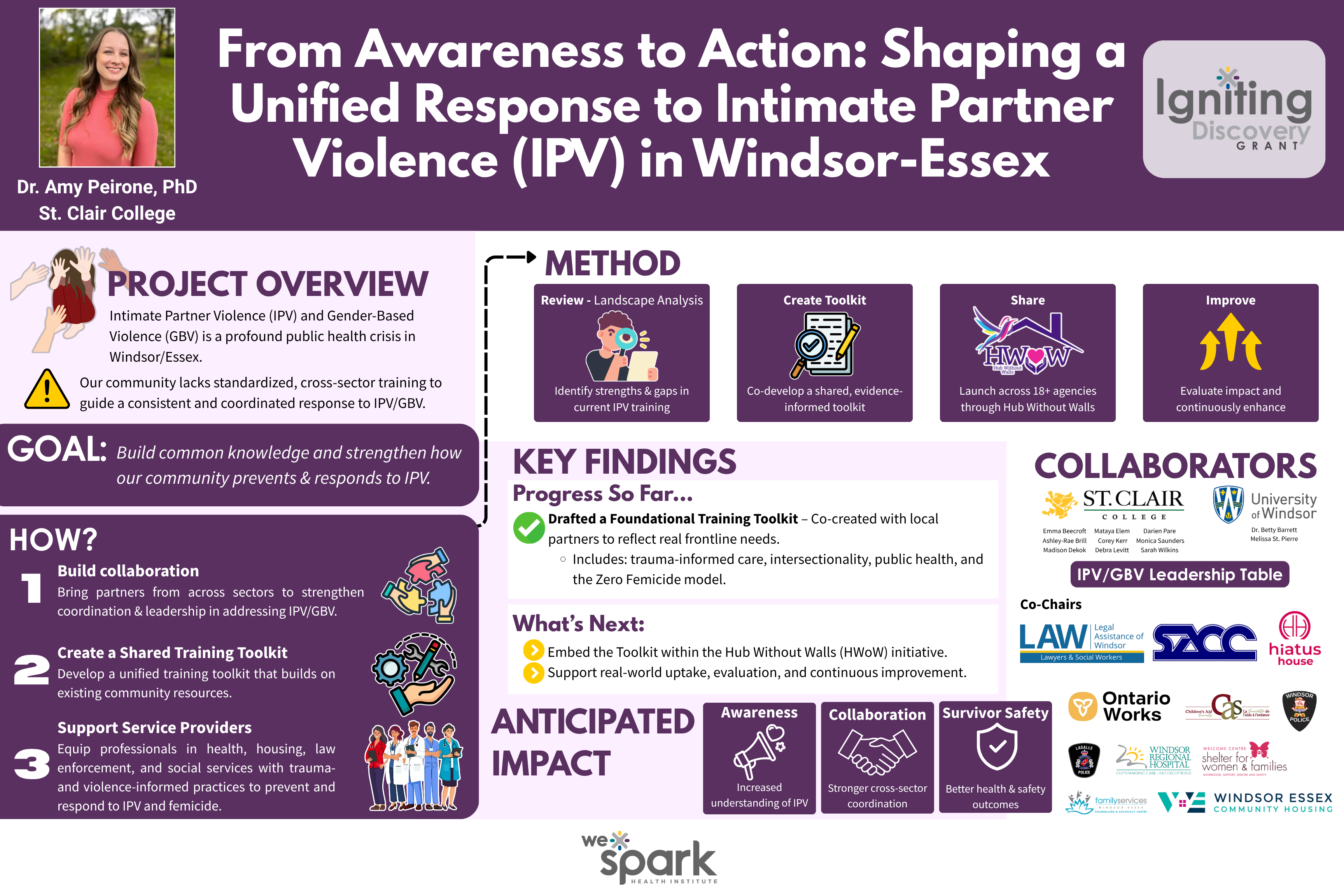 Thanks to the original WE-SPARK Igniting Discovery investment led by Amy Peirone, a network of IPV/GBV partners in Windsor-Essex mobilized to leverage nearly $2.5 million in provincial funding for a transformative initaitve.